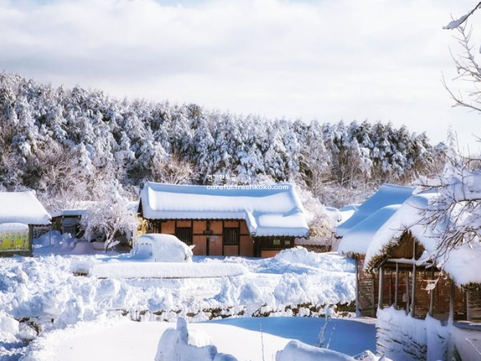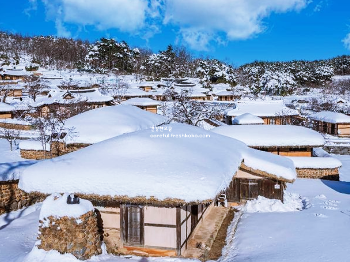 왕곡마을의 겨울 풍경은 마치 시간이 멈춘 듯 고즈넉하고 평화로웠습니다. 고즈넉한 초가집 지붕 위로 소복이 쌓인 눈은 전통 한옥의 아름다움을 더욱 돋보이게 했던 강원도 고성 가볼만한곳 베스트10 여행지 입니다.