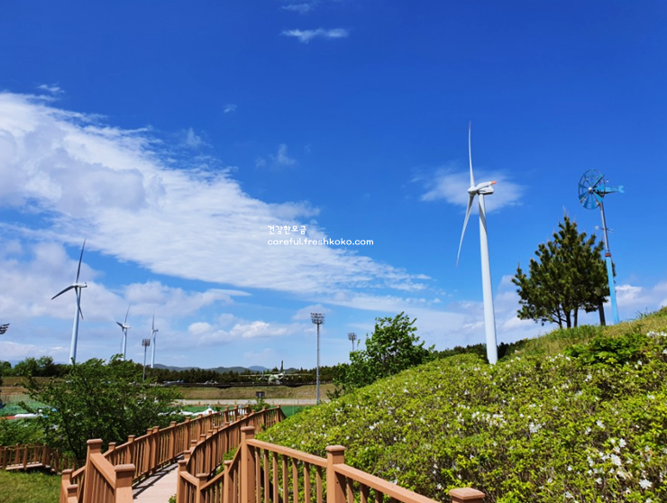 해맞이공원의 풍력발전단지는 거대한 풍차들이 늘어선 독특한 풍경으로 도착하자마자 눈길을 사로잡았습니다. 넓게 펼쳐진 언덕 위에 서 있는 풍력발전기는 맑은 하늘과 어우러져 멋진 장관을 이루고 있었습니다.
