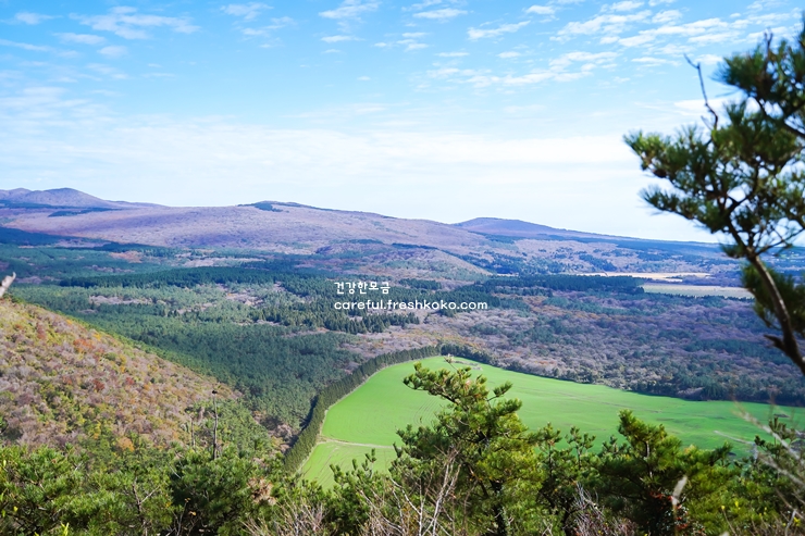 중간쯤 오르다 보면 넓은 풀밭이 펼쳐져 있어 잠시 쉬어가기도 좋았습니다. 오름의 정상에 다다르니, 제주 바다가 시원하게 펼쳐지며 그 절경에 감탄을 금할 수 없었어요. 멀리 보이는 다른 오름들과 함께 어우러진 풍경은 정말 아름다웠습니다.