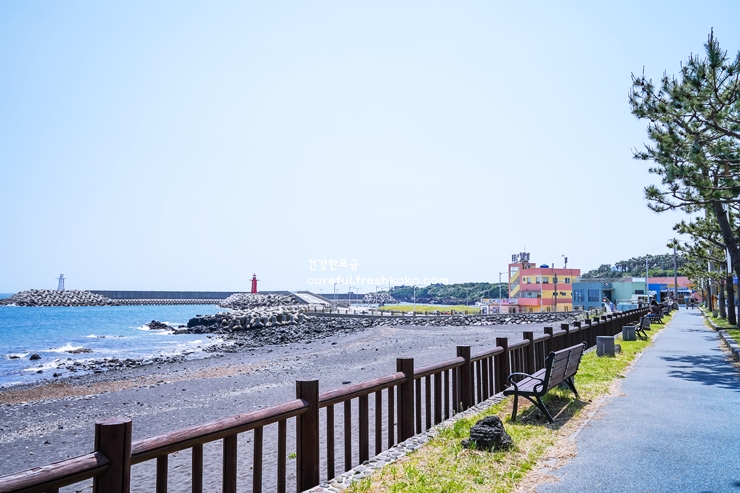 해수욕장 주변에는 조용한 산책로도 잘 조성되어 있어 걷기 좋았고, 바다의 소리를 들으며 산책하는 것이 정말 힐링이 되었습니다. 해변 끝부분에는 바위들이 모여 있어 바위 사이를 탐험하는 재미도 있는 제주도 여행코스 2박3일 장소 입니다.