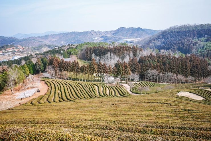 중간중간 벤치에 앉아 차밭을 감상하며 잠시 쉬어갈 수 있는 여유로운 공간도 있었습니다. 녹차밭 끝자락에 위치한 전망대에 오르니, 푸른 차밭과 주변의 산이 한눈에 들어와 감탄이 절로 나왔습니다.