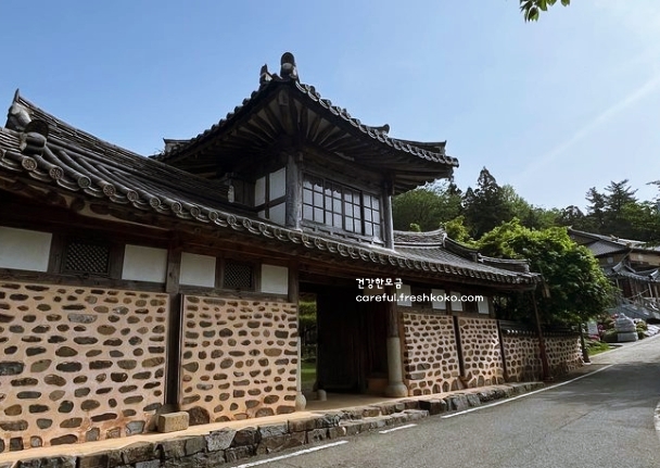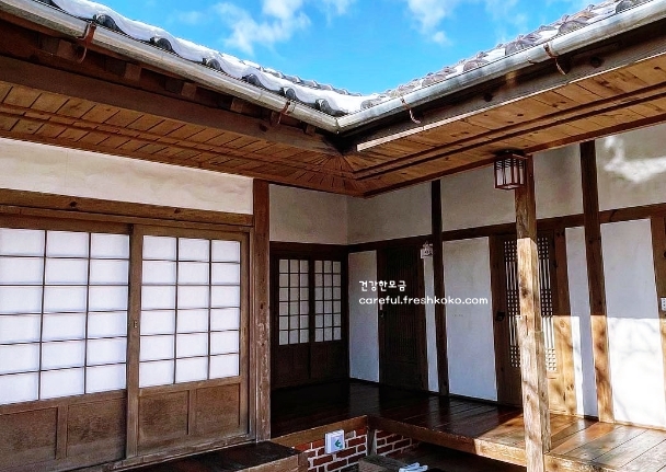 객실은 예스러운 한옥 구조를 그대로 유지하고 있어, 현대적인 편리함 속에서도 전통적인 분위기를 느낄 수 있었습니다. 방 안에서 창문을 열면 한옥 마당이 보였고, 정갈한 돌길과 아기자기한 화분들이 마당 한쪽을 채우고 있었습니다.