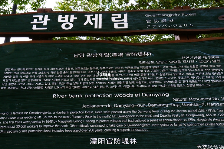 관방제림에 도착하니 300년 넘은 나무들이 줄지어 서 있는 모습이 압도적으로 아름다웠던 담양 가볼만한곳 베스트10입니다. 천연기념물로 지정된 이곳은 오래된 나무들이 만들어내는 그늘과 고요한 분위기가 인상적이었습니다.