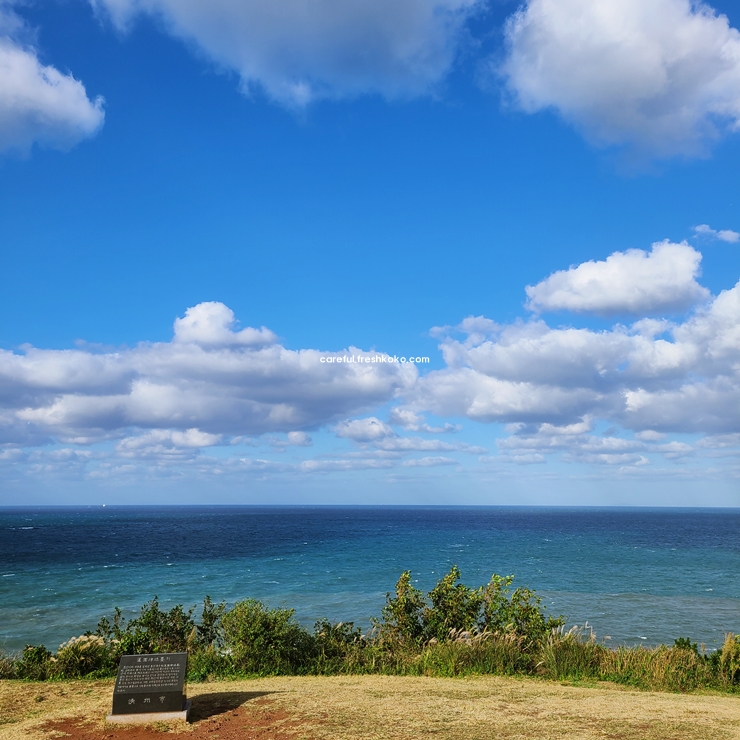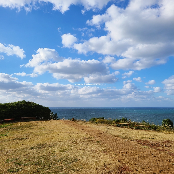 바다를 배경으로 펼쳐진 하늘은 날씨에 따라 다양한 색감을 자랑하는데, 제가 방문한 날은 짙푸른 바다 위로 흰 구름이 두툼하게 깔려 있어 마치 그림 같은 풍경이 펼쳐졌습니다. 바람에 흔들리는 억새와 초록빛 나무들이 자연스럽게 어우러져 제주만의 아름다움을 한껏 느낄 수 있었어요.