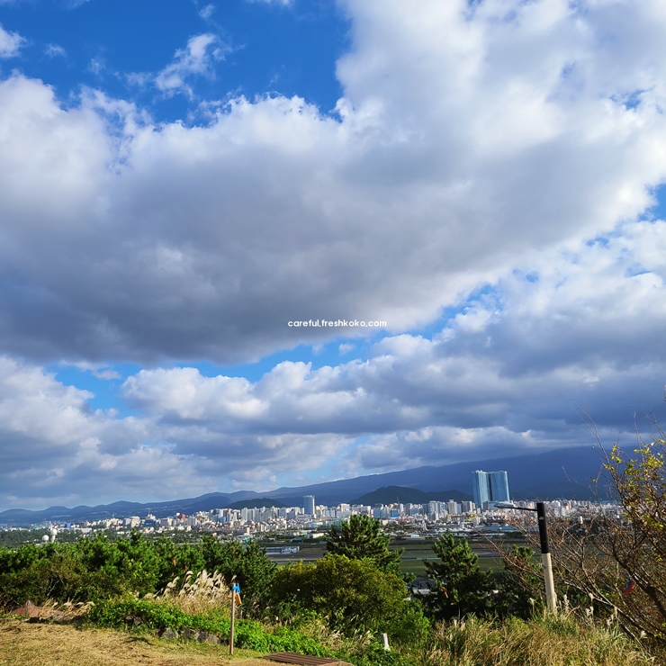 제주도의 가을 하늘과 푸른 바다가 아름답게 펼쳐지는 도두봉은 생각보다 더 멋진 곳이었습니다. 공항에서 가까워 비행기에서 내리자마자 들를 수 있는 위치에 있다는 점도 큰 장점이었죠. 주차는 비교적 수월하게 할 수 있었고, 봉우리까지 오르는 데는 10~15분 정도로 부담 없이 산책하듯 오를 수 있었습니다.