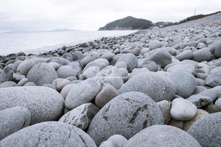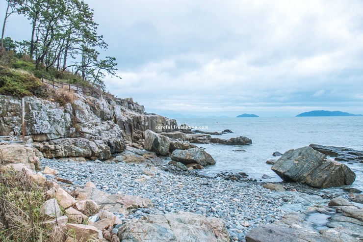 몽돌밭 위를 맨발로 걸어보니 발바닥에 전해지는 촉감이 색다르게 느껴졌습니다. 해변 끝자락에 위치한 나무 데크 전망대에서는 투명한 바다와 섬들이 어우러진 풍경을 감상할 수 있었습니다.