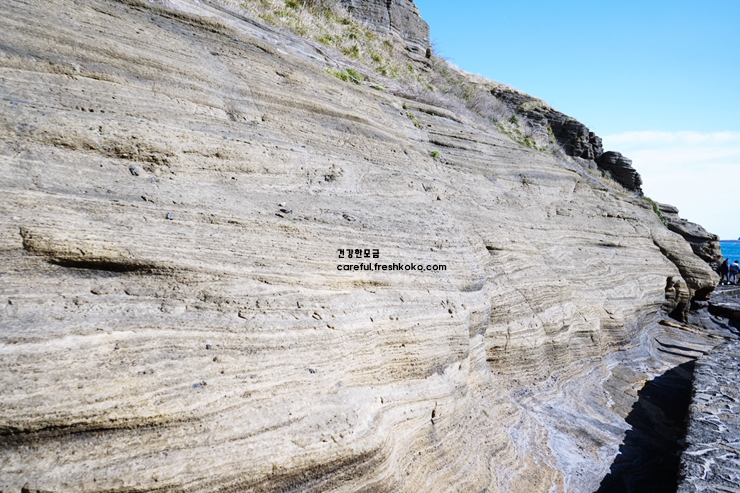 입구를 지나 해안으로 내려서면 눈앞에 펼쳐진 절벽의 모습은 마치 지구의 역사가 그대로 새겨져 있는 듯합니다. 층층이 쌓인 지층들은 수만 년 동안 쌓인 용암과 화산재가 만들어낸 자연의 걸작입니다.